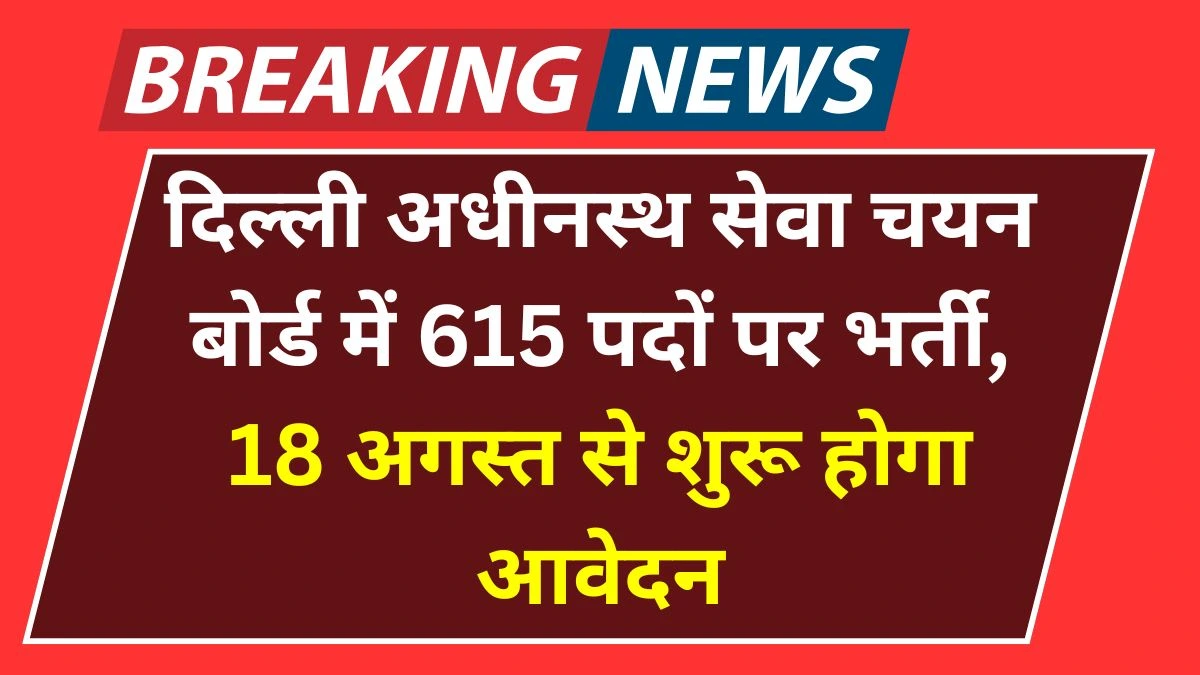 DSSSB Recruitment 2025: दिल्ली अधीनस्थ सेवा चयन बोर्ड (DSSSB) ने नायब तहसीलदार, असिस्टेंट पब्लिक हेल्थ इंस्पेक्टर, क्लर्क सहित कई पदों पर कुल 615 रिक्तियों के लिए भर्ती अधिसूचना जारी की है। इच्छुक उम्मीदवार 18 अगस्त 2025 से आवेदन कर सकेंगे। आवेदन प्रक्रिया पूरी तरह ऑनलाइन होगी और इसके लिए उम्मीदवारों को DSSSB की आधिकारिक वेबसाइट पर जाना होगा। यह भर्ती विभिन्न विभागों और पदों के लिए है, जिसमें अलग-अलग शैक्षणिक योग्यता और वेतनमान निर्धारित किए गए हैं।